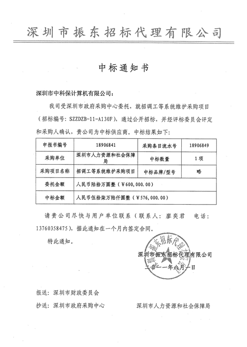 中标通知书(招标编号SZZDZB-11-A130F)