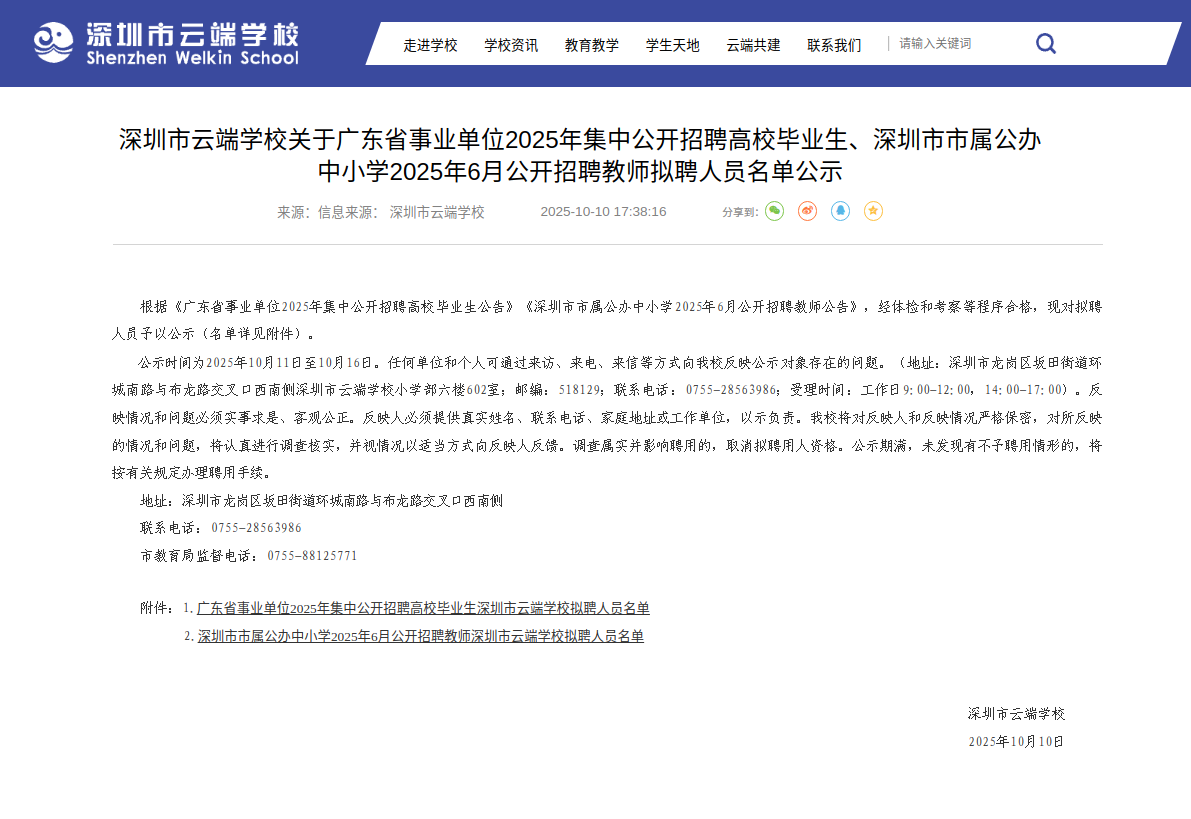 深圳市云端学校关于广东省事业单位2025年集中公开招聘高校毕业生、深圳市市属公办中小学2025年6月公开招聘教师拟聘人员名单公示,具体链接为: